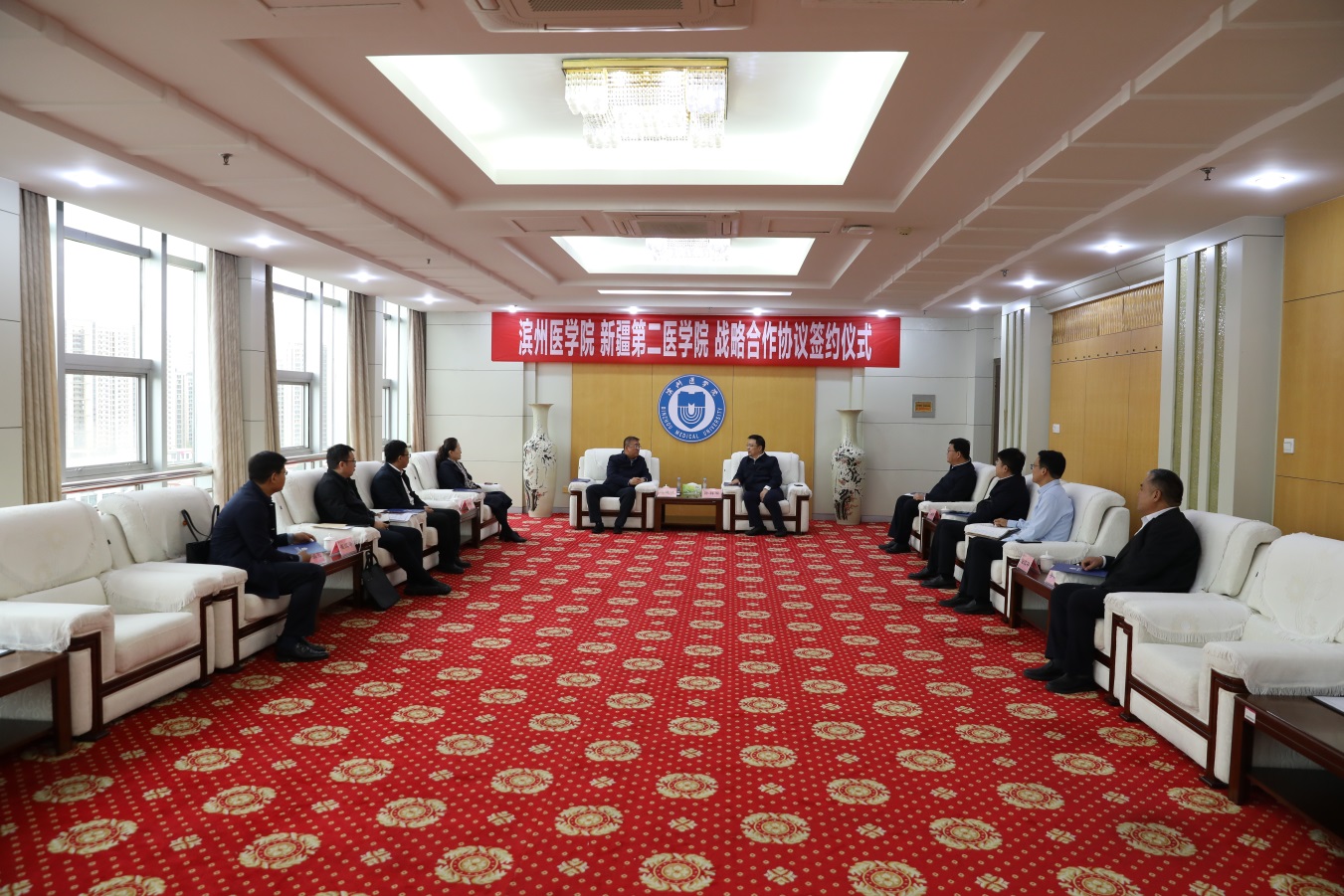 10月13日上午,学校与新疆第二医学院签署战略合作协议。党委书记孙祥军,党委委员、副院长赵景刚,新疆第二医学院党委书记冯述江,党委常委、副校长徐培兰出席签约仪式。