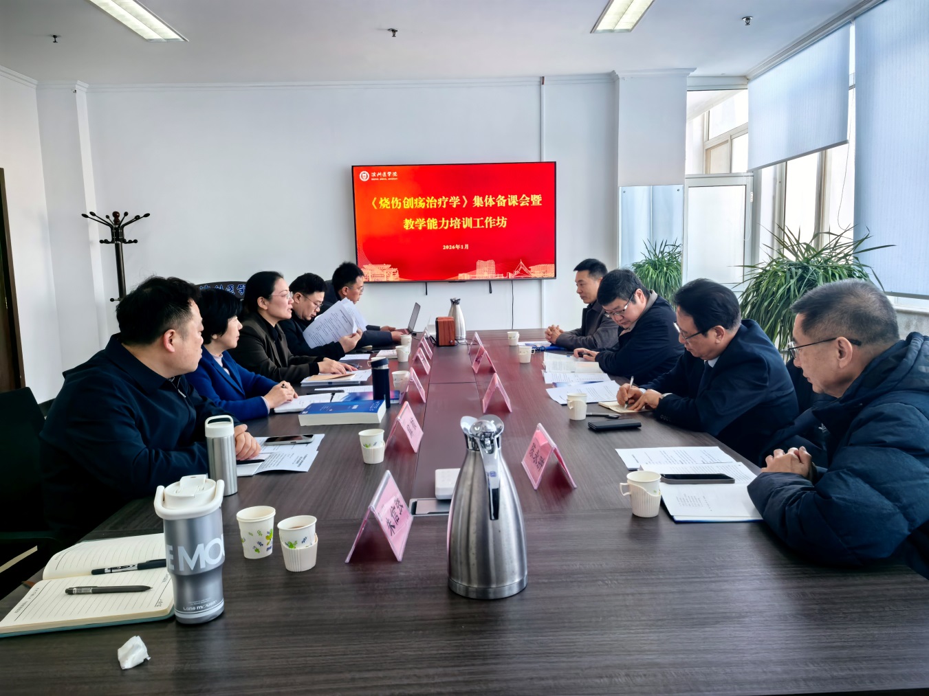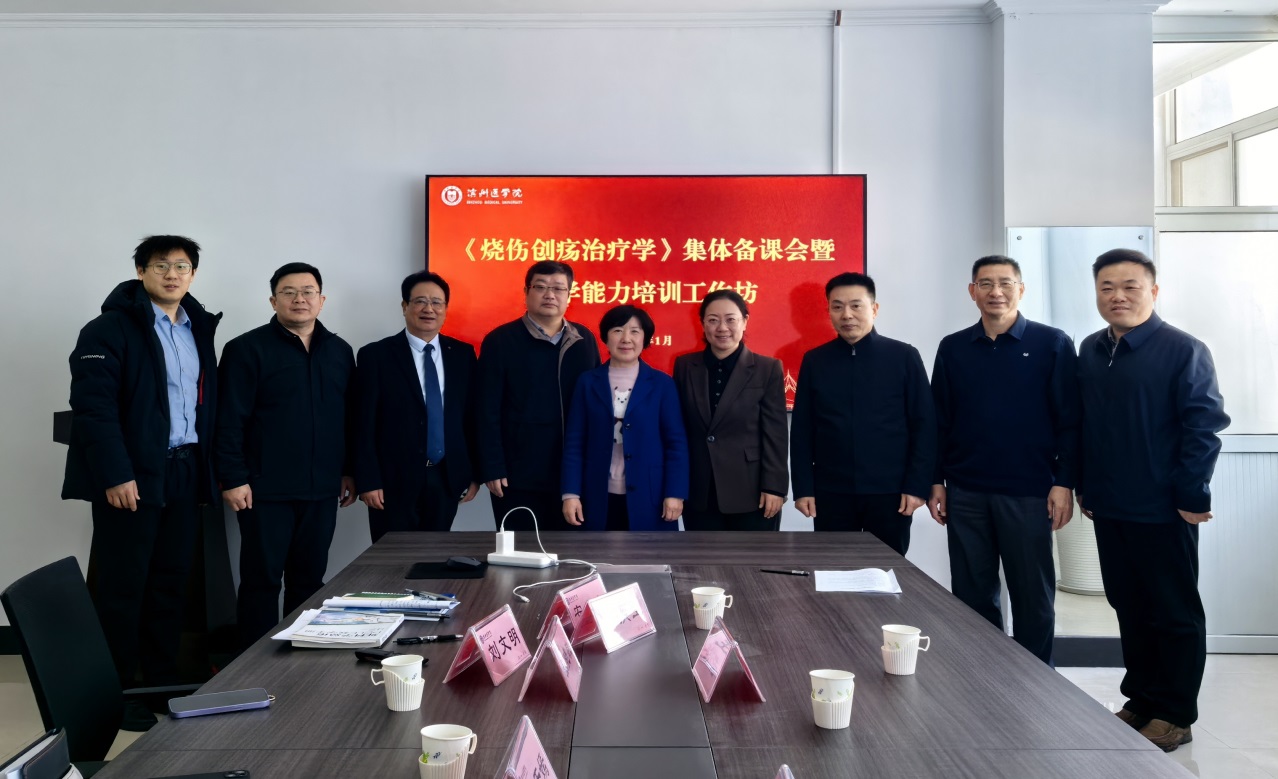 会见后,上午举行《烧伤创疡治疗学》集体备课会。滨州医学院教务处副处长、第一临床医学院副院长张晓敏主持会议,她对校外4位专家教授莅临学校参加集体备课与教学技能培训表示欢迎和感谢,简要介绍了我校临床医学专业美宝国际班的办学特点、人才培养方案和特色课程群情况,将进一步提升任课教师与教学管理人员对课程建设与教学质量的重视程度。课程负责人刘文明带领参会人员深入研讨课程教学大纲与教学计划,并逐一达成共识。徐荣祥再生医学研究中心联席主任刘于嫣介绍相关教学规范,强调任课教师要更新教育教学理念,以学生发展为中心,丰富教学内容,改革教学方法与手段,加强智能化辅助教学,关注学生三维学习目标达成度。彭浩主任针对打造具有校企合作特色的精品课程提出了相关建议。